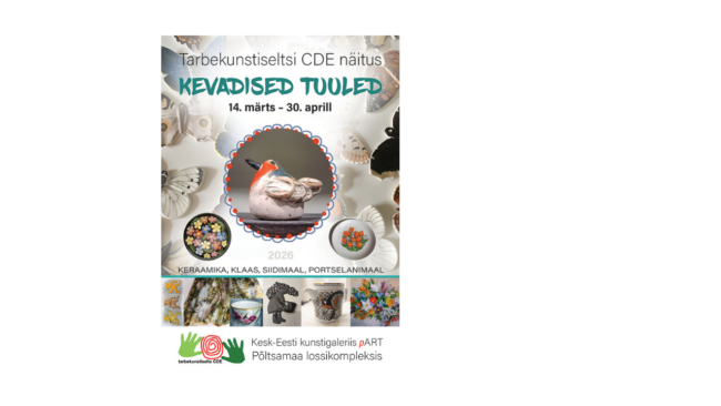 AVAMINE: 14. märtsil kell 14. Kevadnäitus koondab Tarbekunstiseltsi CDE kunstnike värske loomingu. Väljapanekus on esindatud keraamika, klaasikunst, siidimaal ja portselanimaal. Näitus pakub mitmekesist materjali- ja vormikeelt ning rõhutab tarbekunsti kaasaegseid tõlgendusi. Näitust saab külastada 14. märts – 30. aprill!