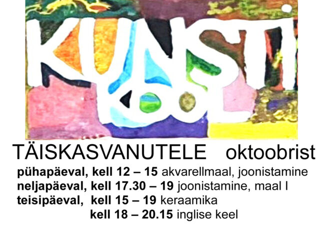 NÄITUS avatud E -L 10 – 17 P 12 – 15 IMPRESSIOON (mulje) fooliumi ja valgega, nii tasapinnaliste kui ka ruumiliste objektide peal, annab taas uue alguse meie galeriitegevusse pärast pikka remondiaega. Teine märksõna KUBISM, st abstraheeritud vormid. Näitusel osalevad nii täiskasvanud kui noored sügissemestril tehtud töödega. Avamisel loob meeleolu kaasaegne muusika ja noorte tuleetendus.